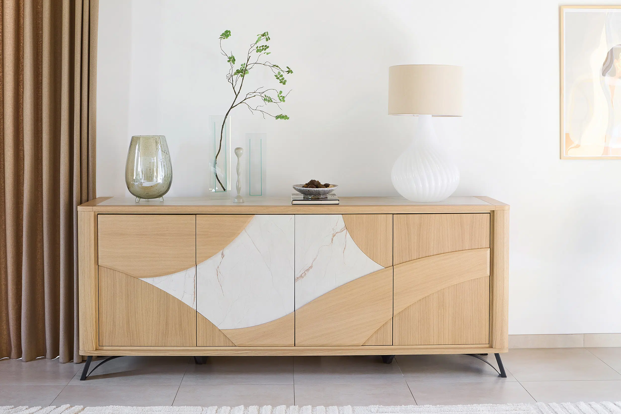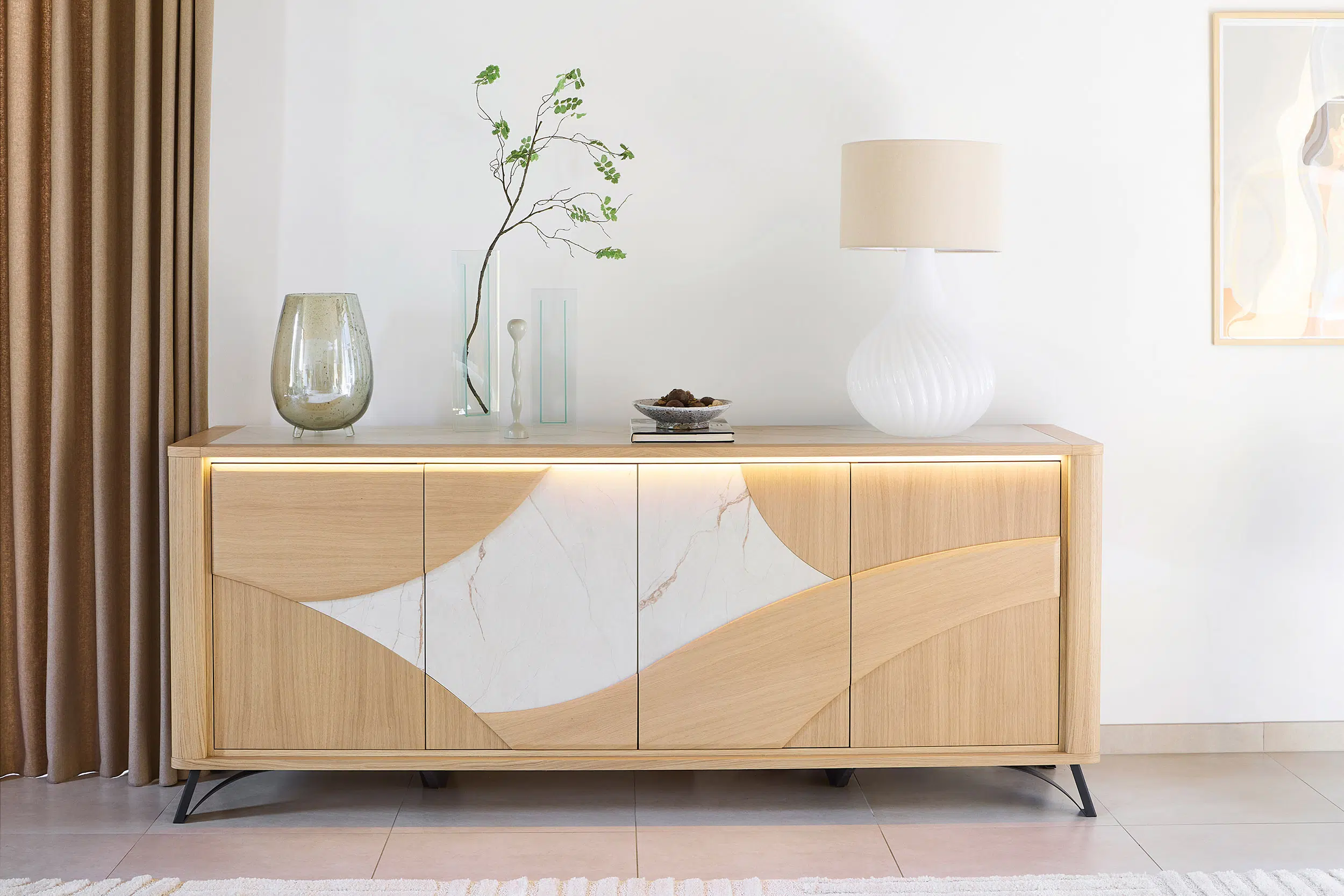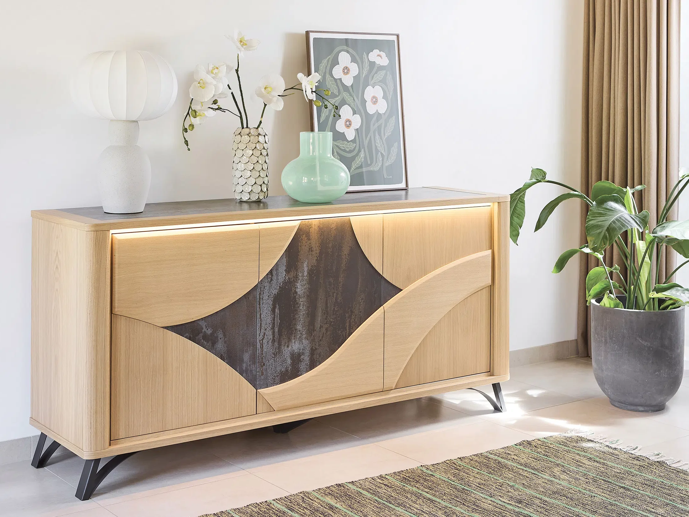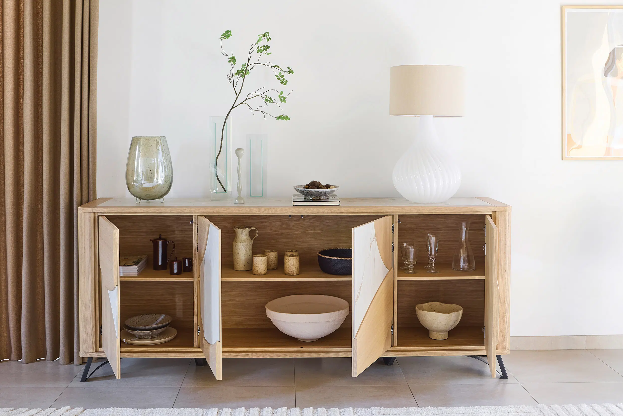 Ce buffet au design contemporain associe élégamment le bois et la céramique Dekton, proposée en coloris beige ou brun, pour un rendu à la fois chaleureux et sophistiqué. Modulable, il offre la possibilité d’ajouter un tiroir central ou des étagères supplémentaires, et se décline en trois dimensions, avec 3 ou 4 portes, afin de s’adapter parfaitement à tous les espaces. Fonctionnel et raffiné, il allie esthétisme, durabilité et personnalisation.