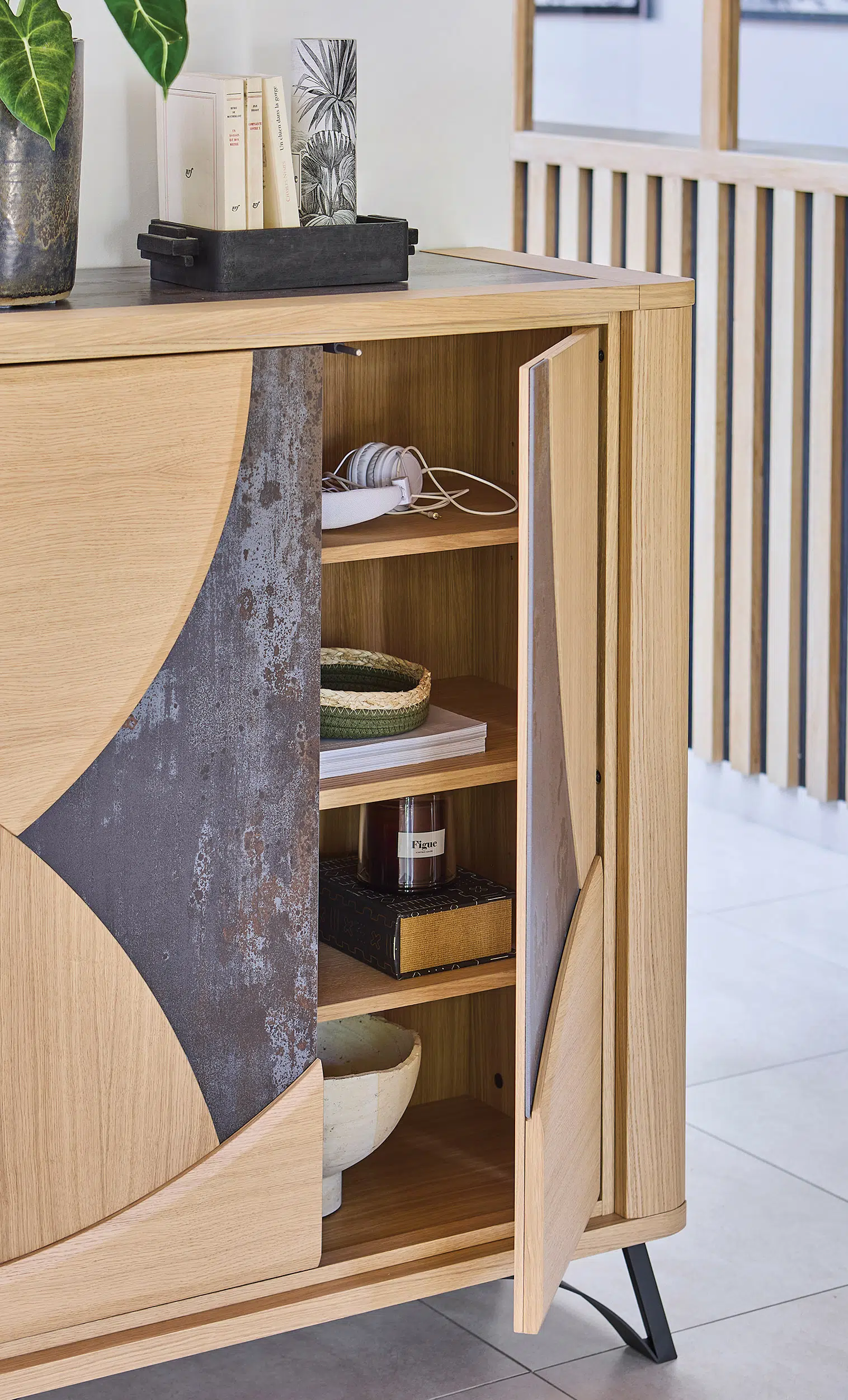 Ce buffet au design contemporain associe élégamment le bois et la céramique Dekton, proposée en coloris beige ou brun, pour un rendu à la fois chaleureux et sophistiqué. Modulable, il offre la possibilité d’ajouter un tiroir central ou des étagères supplémentaires, et se décline en trois dimensions, avec 3 ou 4 portes, afin de s’adapter parfaitement à tous les espaces. Fonctionnel et raffiné, il allie esthétisme, durabilité et personnalisation.